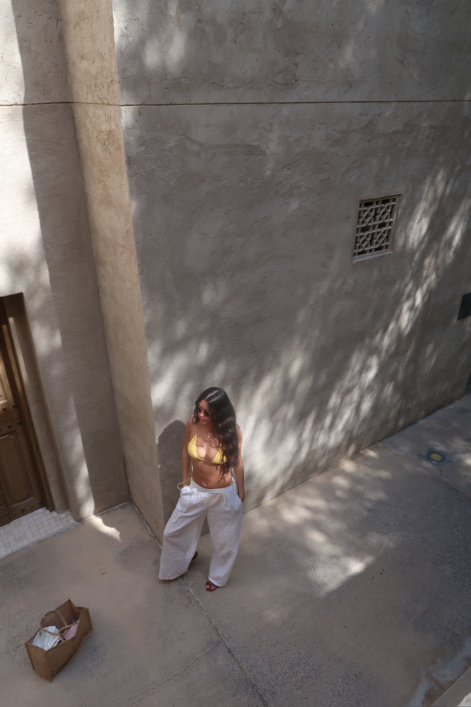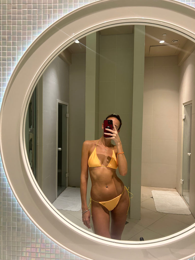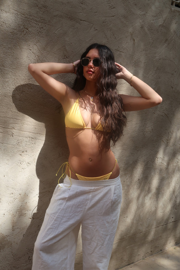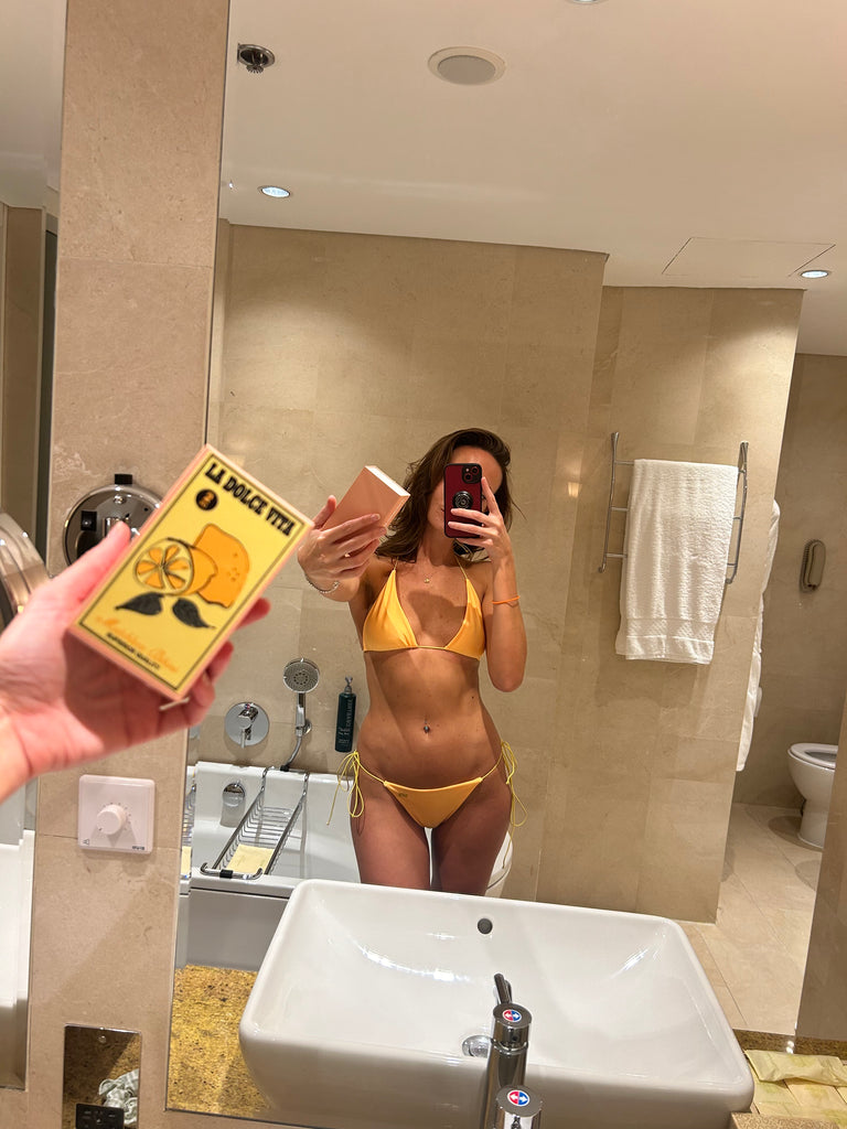 Introducing 'La Dolce Vita' – bask in the golden glow of summer with our radiant golden yellow bikini, delicately accented with contrasting yellow strings. Inspired by the sun-kissed shores of the Amalfi Coast and the zesty fragrance of lemons, immerse yourself in the essence of effortless elegance. Embrace the spirit of leisure and luxury as you adorn yourself in this ode to Mediterranean bliss. Let 'La Dolce Vita' be your passport to endless summer adventures.