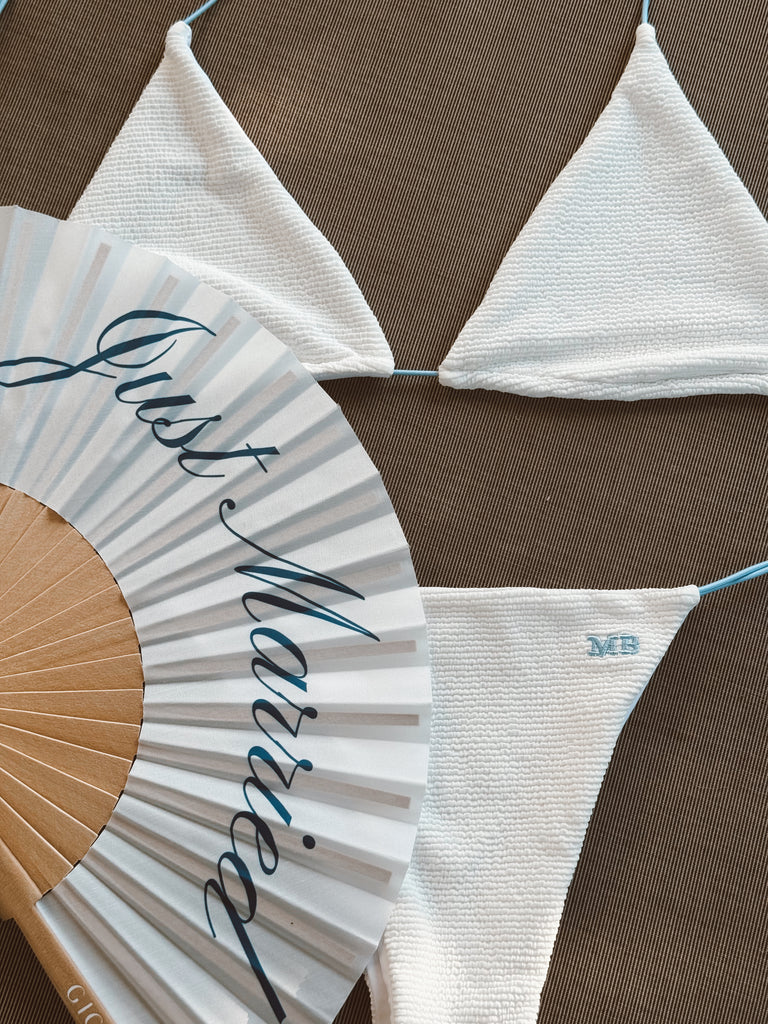 "Something Blue" – a crisp white bikini with striking blue strings, crafted in our new textured crinkle fabric for a fresh spin on bridal vibes. A playful nod to tradition with a modern edge, it’s perfect for the beach, the bachelorette, or wherever you’re celebrating.